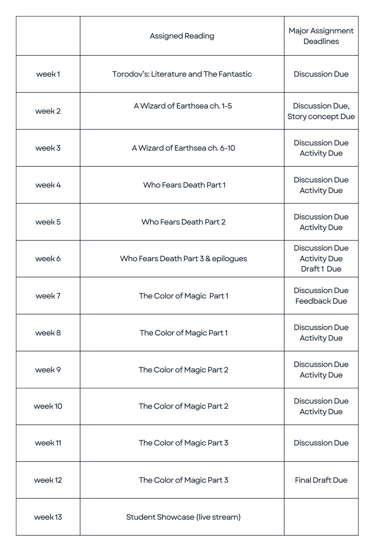 This 12-week workshop focuses on creating and critiquing fantasy stories using Liz Lerman's Critical Response Process. Students will examine key works in the genre, explore fantasy's ability to challenge and transform societal norms, and workshop their own stories. Through guided feedback, participants will develop their voice, refine their craft, and support their peers in creating resonant, imaginative works.